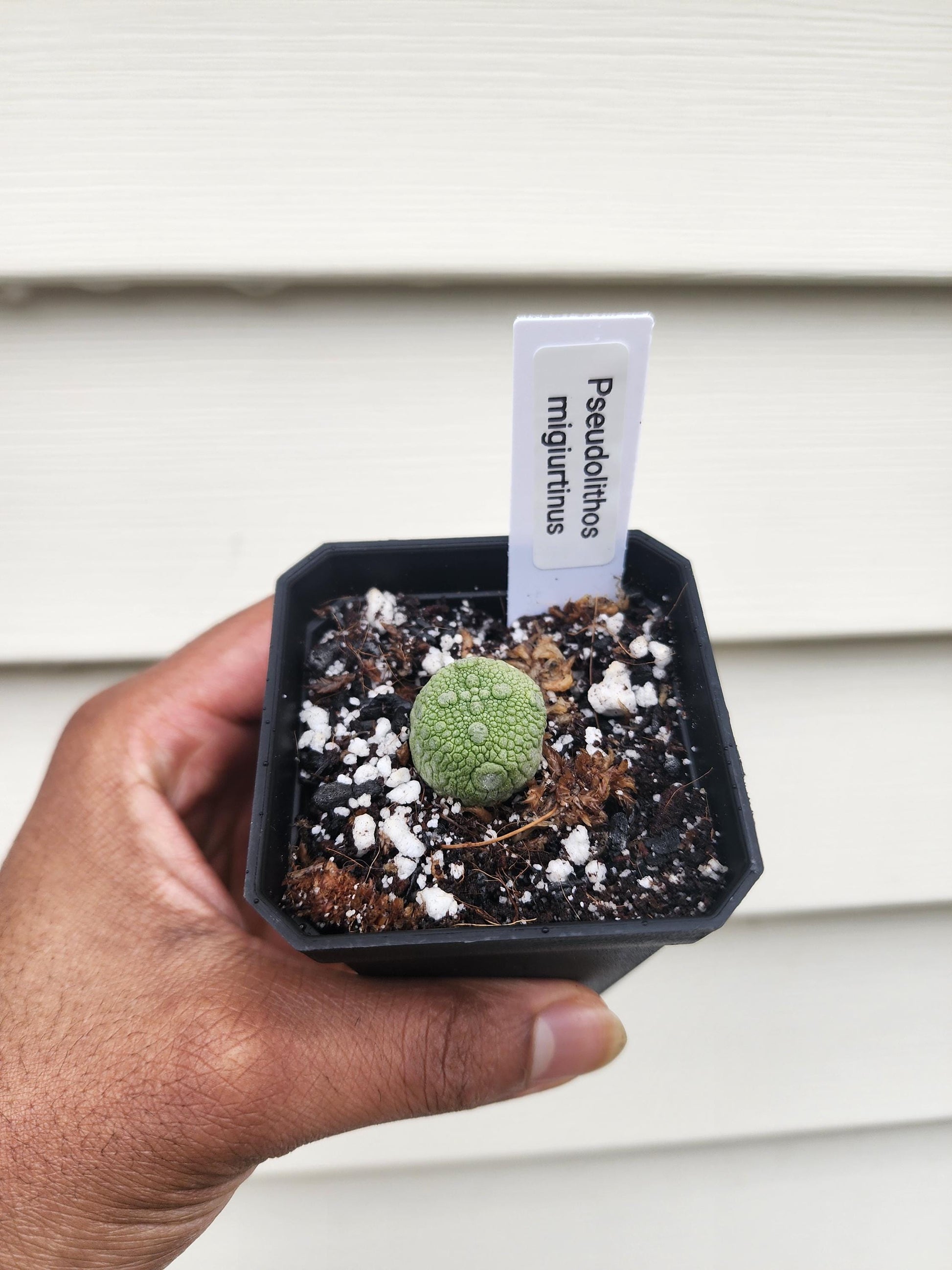 Small unusual succulent that resembles a stone. Grows very well in high light and is drought tolerant. About 0.5-1 inch across.