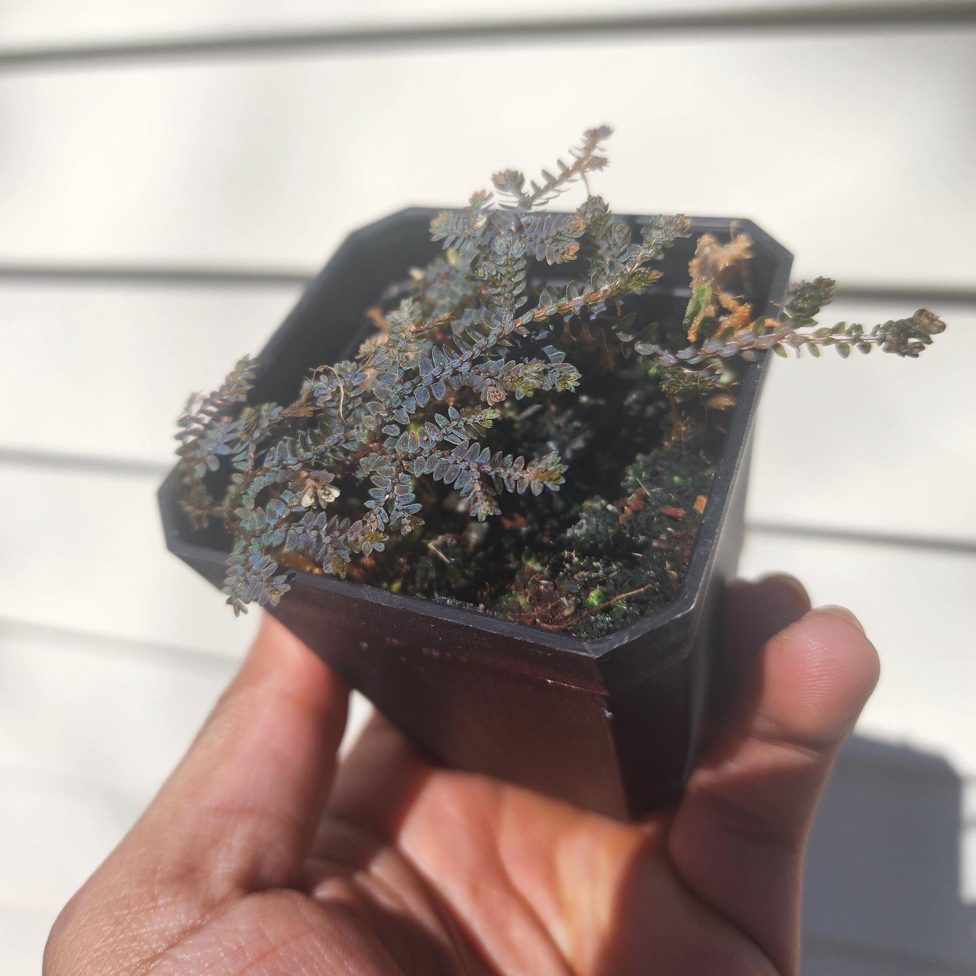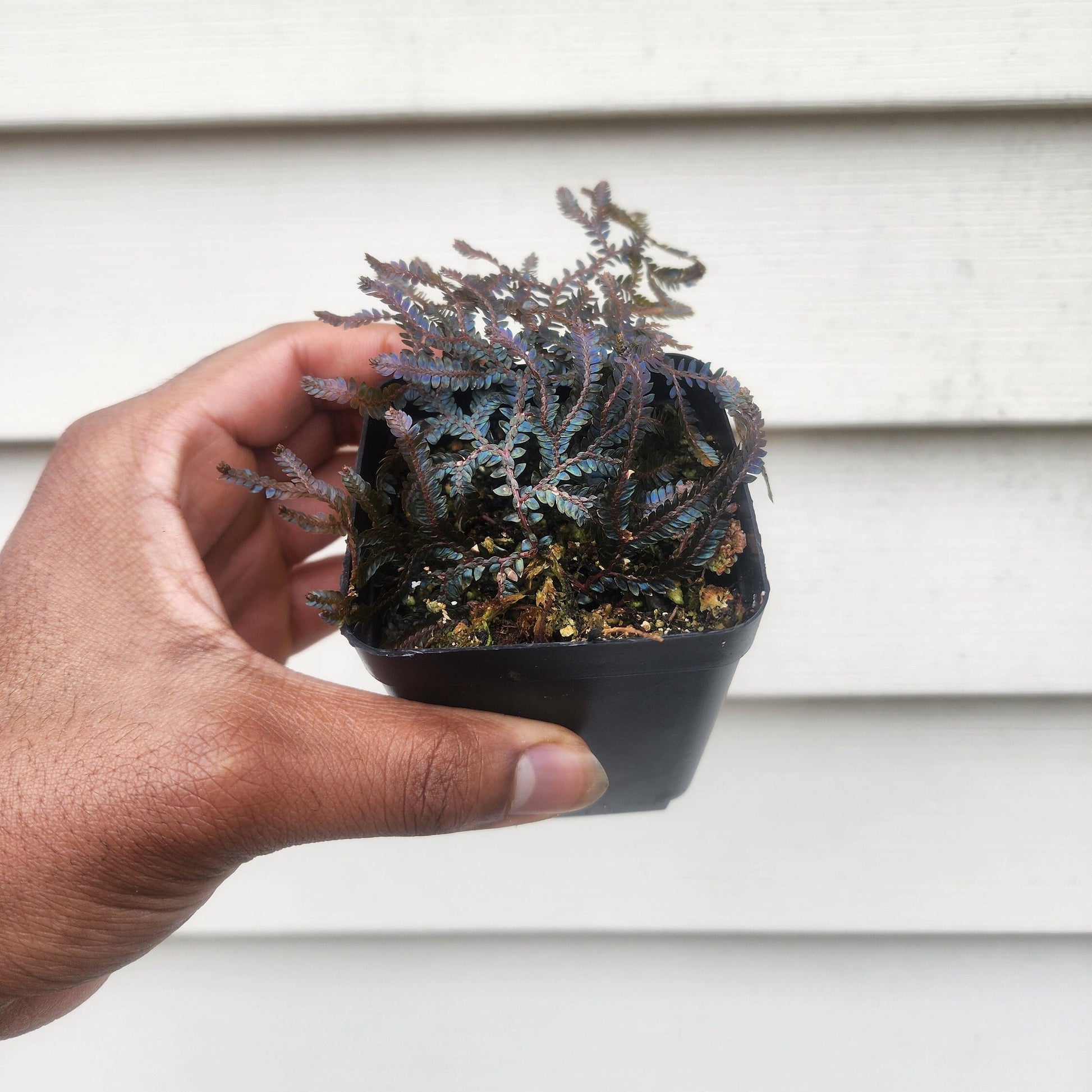 Selaginella willdenowii, or Peacock Moss, is an incredibly beautiful plant. It shines blue under light, and grows in a vertical or creeping habit. This plant does well in terrariums, and can get quite large.